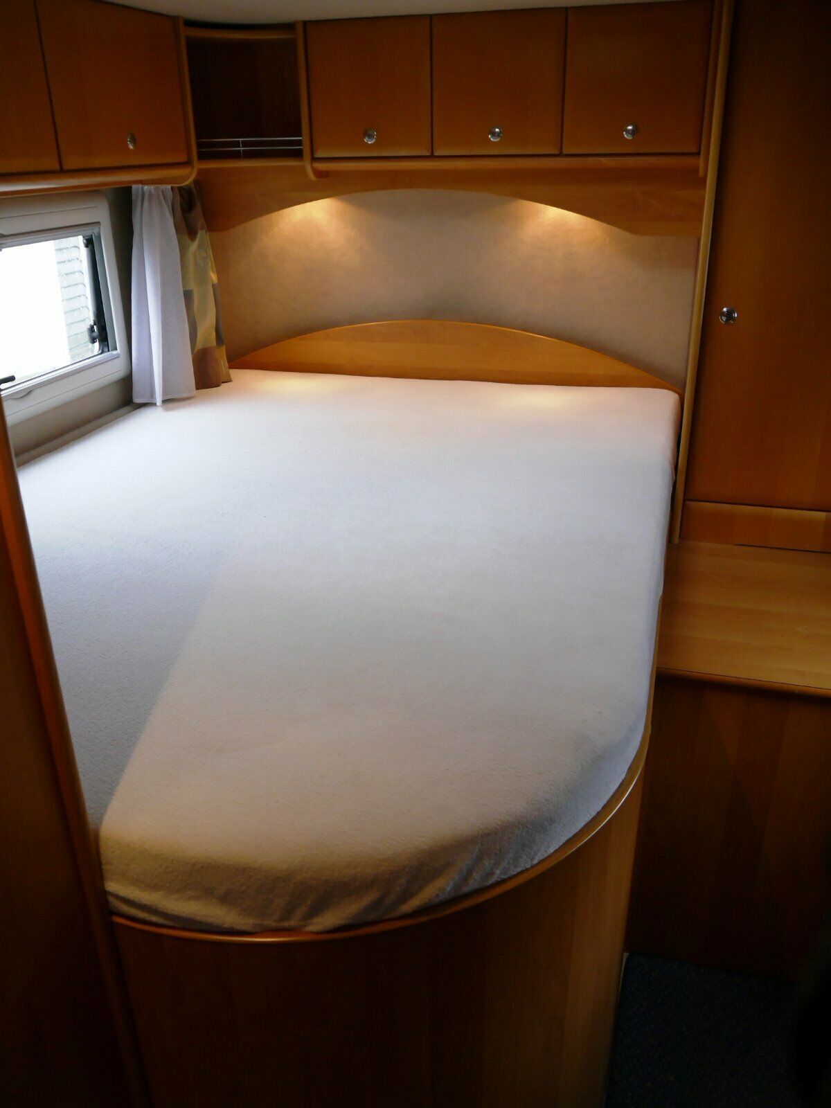 Im Heck befindet sich ein französisches Doppelbett (145 × 200 cm), durch eine Tür vom Wohnbereich abtrennbar.